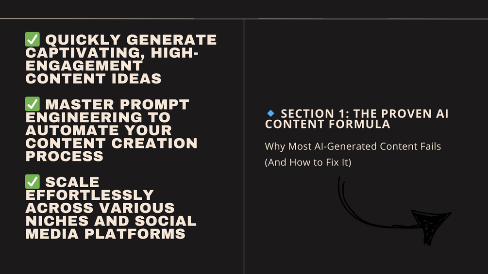 🔹 Section 1: The Proven AI Content Formula -Why Most AI-Generated Content Fails (And How to Fix It)🔹 Section 2: 100+ High-Performance AI Prompts - 🔹 Section 3: Automation Workflow for AI Creators